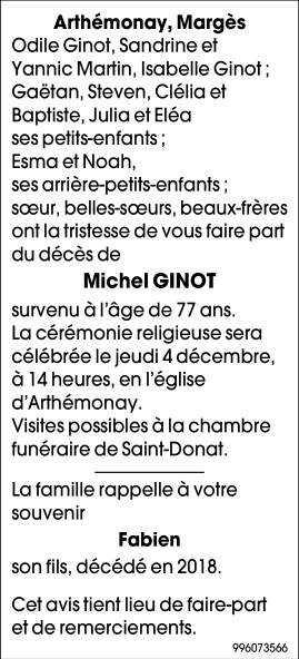 Décédé à Romans-sur-Isère (26100, France) le dimanche 30 novembre 2025 à l'âge de 77 ans